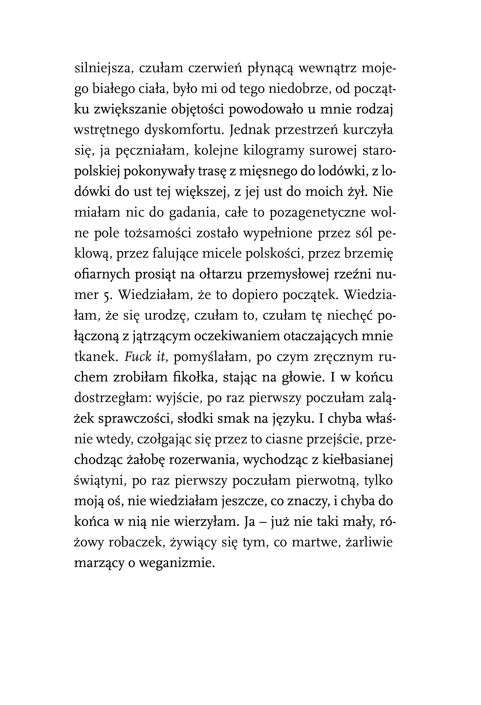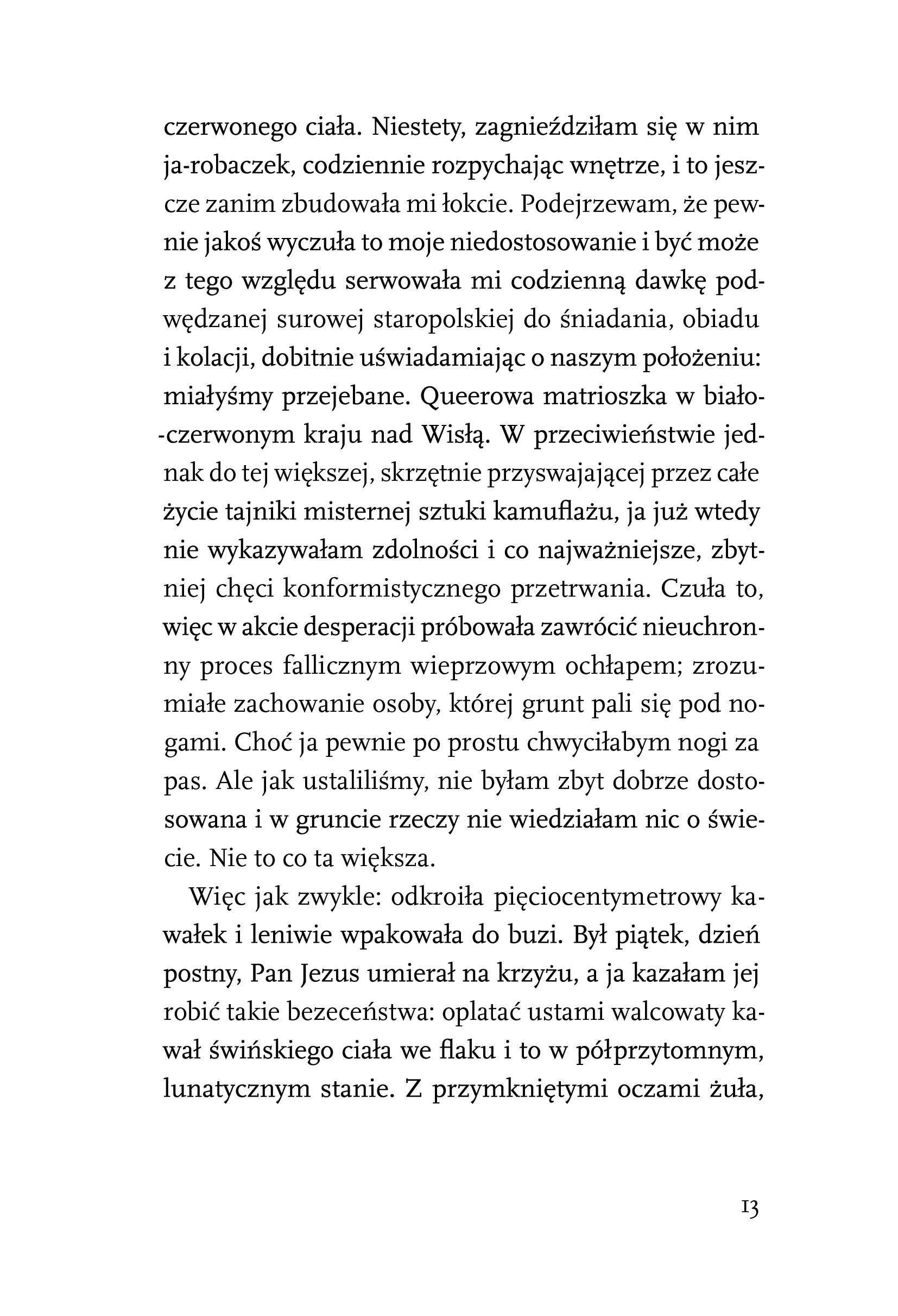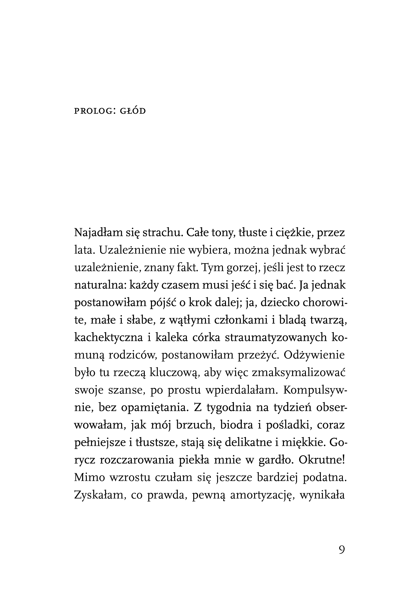 Ta książka jest opowieścią o doświadczaniu, emocjach i pamięci; o niespodziewanych spotkaniach przy stole i zmysłowej fascynacji, która może narodzić się nawet podczas smażenia placków; o czasach, gdy wszystko działo się naraz, a żylasta łapa kucharki nakładała mielone z buraczkami na wyszczerbione talerze; o rodzinnych królowych wypieków obdarowujących nas słodkościami, po których w ustach na zawsze zostaje gorzki posmak; o rosole pitym po seksie, kawie rozpuszczalnej (ma swoje momenty!), barszczu Amino i Cheetosach – tej wspaniałej instant przyjemności; o ciele, diecie, zdrowiu i pracy w gastronomii (od niej wszystko się zaczęło!); i wreszcie o tym, że można czasem odpłynąć w poczuciu winy i spełnienia, w poczuciu porażki i triumfu.