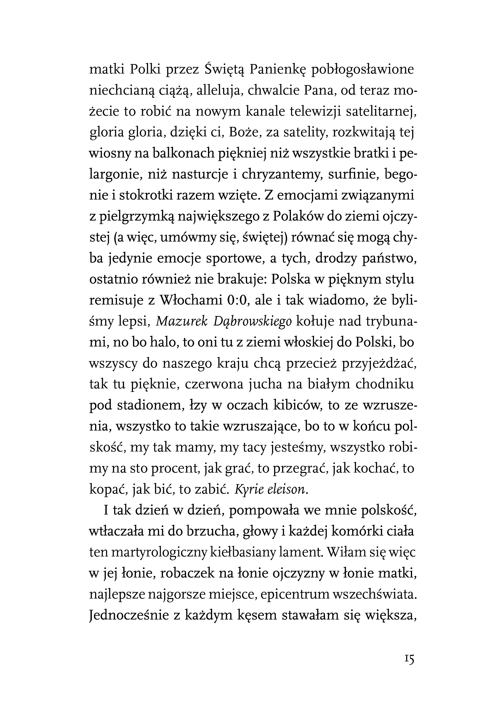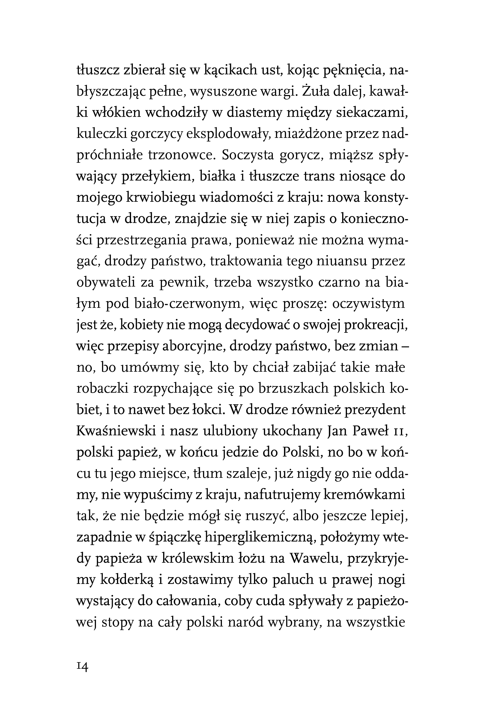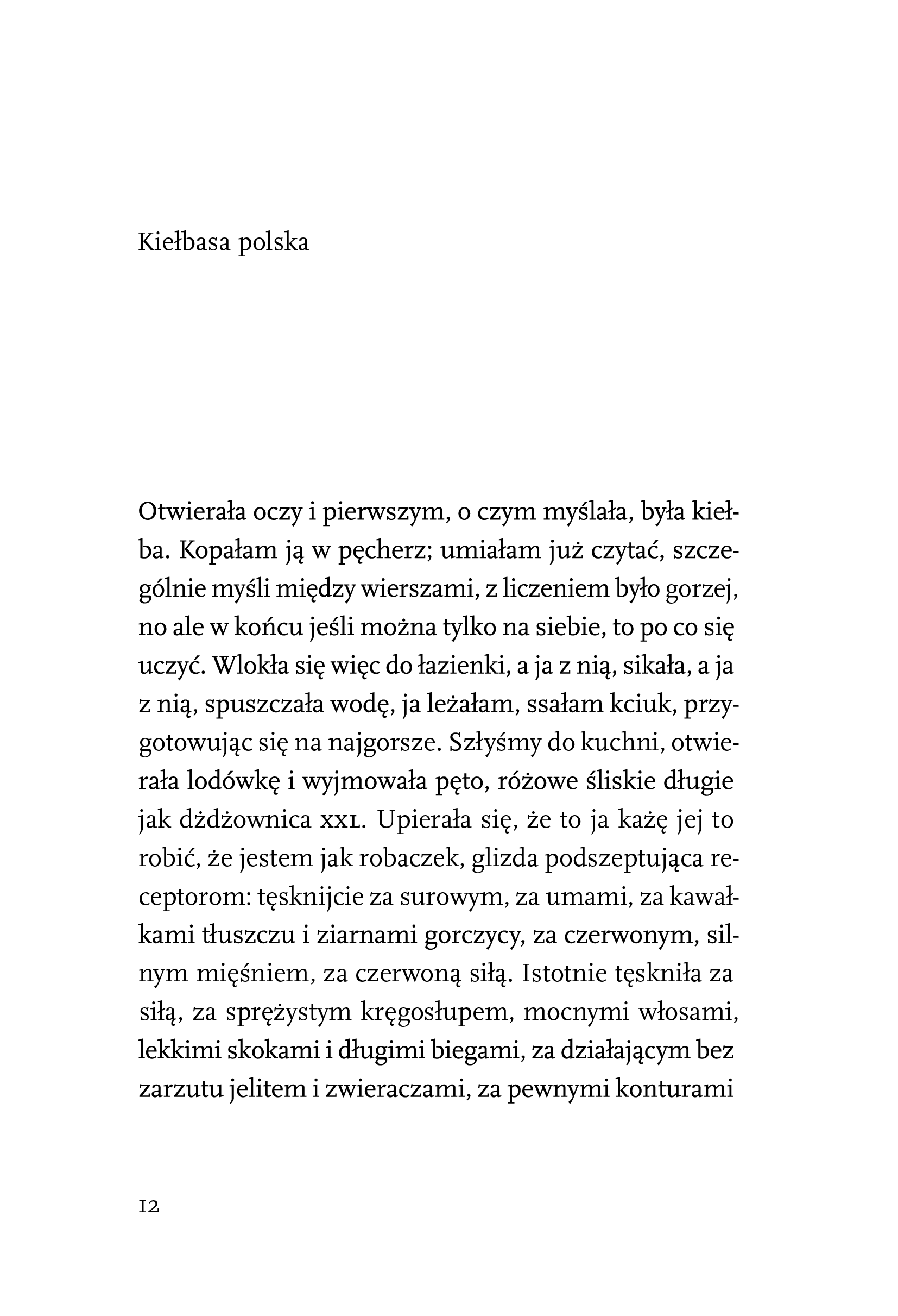 Ta książka jest opowieścią o doświadczaniu, emocjach i pamięci; o niespodziewanych spotkaniach przy stole i zmysłowej fascynacji, która może narodzić się nawet podczas smażenia placków; o czasach, gdy wszystko działo się naraz, a żylasta łapa kucharki nakładała mielone z buraczkami na wyszczerbione talerze; o rodzinnych królowych wypieków obdarowujących nas słodkościami, po których w ustach na zawsze zostaje gorzki posmak; o rosole pitym po seksie, kawie rozpuszczalnej (ma swoje momenty!), barszczu Amino i Cheetosach – tej wspaniałej instant przyjemności; o ciele, diecie, zdrowiu i pracy w gastronomii (od niej wszystko się zaczęło!); i wreszcie o tym, że można czasem odpłynąć w poczuciu winy i spełnienia, w poczuciu porażki i triumfu.